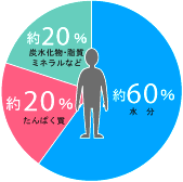 私たちのからだは、約60%が水分、約20%がたんぱく質、残りは炭水化物や脂質、ミネラルなどでできています。なかでもたんぱく質は、体内で筋肉や臓器、皮膚や髪、血液などの成分となります。このたんぱく質をつくっているのがアミノ酸です。