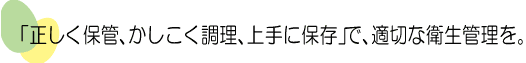 • 包丁、食器、まな板、ふきんなどは使用後洗剤と流水でよく洗い、特に生肉や魚を扱った調理器具は、その都度よく洗う。