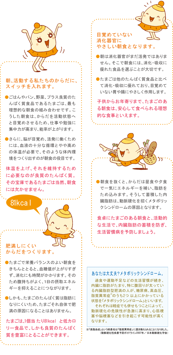 朝食を欠食する人は、常に食事の時間が不規則で、 食事の内容も偏りがちとの調査結果があります。手軽で栄養満点な朝食メニューの強い味方”たまご”。<朝たま習慣>には、こんなに多くの健康メリットがあります。