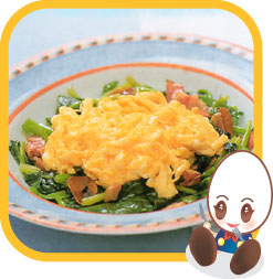 | ③ | ②のフライパンにサラダ油小さじ2を足し、にんにくを炒め、ベーコン、ほうれん草を加えて強火でさっと炒め、軽く塩・こしょうをし、器にのせ、上に②のタマゴをのせる。 |