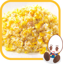 | ① | フライパンに油を熱し、溶きたまごを流し入れて、大きくかき混ぜ、半熟状になったらごはんを加えて炒める。 |