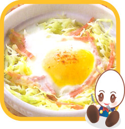 | ① | 50秒から1分加熱するだけ! ココット皿にバターを薄く塗り、キャベツ、ベーコンを入れ、中央にたまごを割り入れて塩、こしょうをふる。ラップにかけて電子レンジ(600W)で50秒から1分加熱する。 |