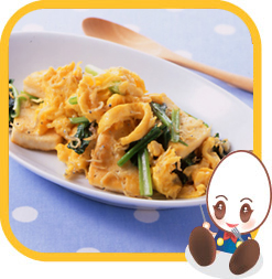 | ② | 残りの油をフライパンに加え、ジャコをカリカリに炒め、小松菜を加えしんなりしてきたら、豆腐をもどし入れる。塩、こしょうを加えて混ぜたたまごをまわし入れてとじ、しょうゆをまわしかけ、さっと炒める。 |