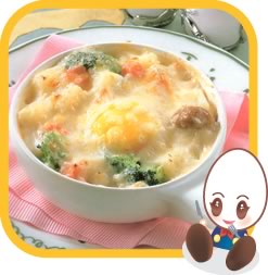 | ④ | 耐熱容器に②と③を4等分して入れ、中央にタマゴを1個ずつ割り入れてホワイトソース、チーズを1/4量ずつかける。 |