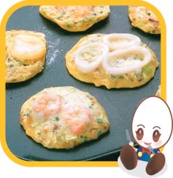 | ② | ホットプレートに油をひき、小さめに片面を焼き、ほどよい大きさのイカ、ほたて貝、えびをおのおののせて焼き、うら返して焼き、好みでしょうゆをかけます。 |