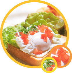 | ③ | トーストしたパンにバター、マスタードを塗り、サラダ菜、②のポーチドエッグ、トマトをのせる。お好みでフライドポテトなどを添える。 |
