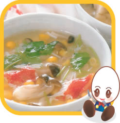 | ⑥ | 小鍋に水とスープの素を入れ、しめじ、残りのかに、コーンを入れて塩を加える。 |