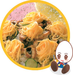 | ⑥ | 人肌に冷めたすし飯に③~⑤を混ぜて器に盛り、最後に錦糸卵をのせる。 |