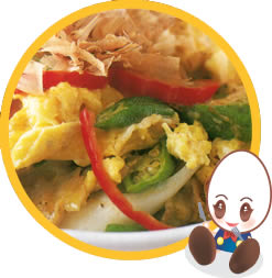 | ③ | Aで味を調え、といておいたタマゴを入れて混ぜる。半熟になったら火を止めて器に盛り、おかかを散らす。 |