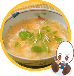 ①に溶いたタマゴを線状に流し入れ、煮立つ前に火を止め、器に盛り、三つ葉とゆずを散らす。