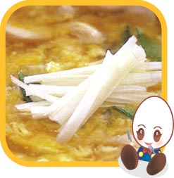 | ⑤ | タマゴを流し入れ、少し固まってきたら大きく混ぜ火を止め器に盛って白髪ねぎを添える。 |