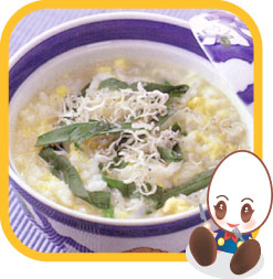 | ② | 鍋にだし汁(600cc)を沸かし、うす口しょうゆ少々と塩少々で味付けし、煮立ったらごはんを入れ、2~3分煮る。ニラと溶きたまごを加えてフタをして火を止め、2~3分蒸らす。器に盛り、ちりめんじゃこを散らす。 |